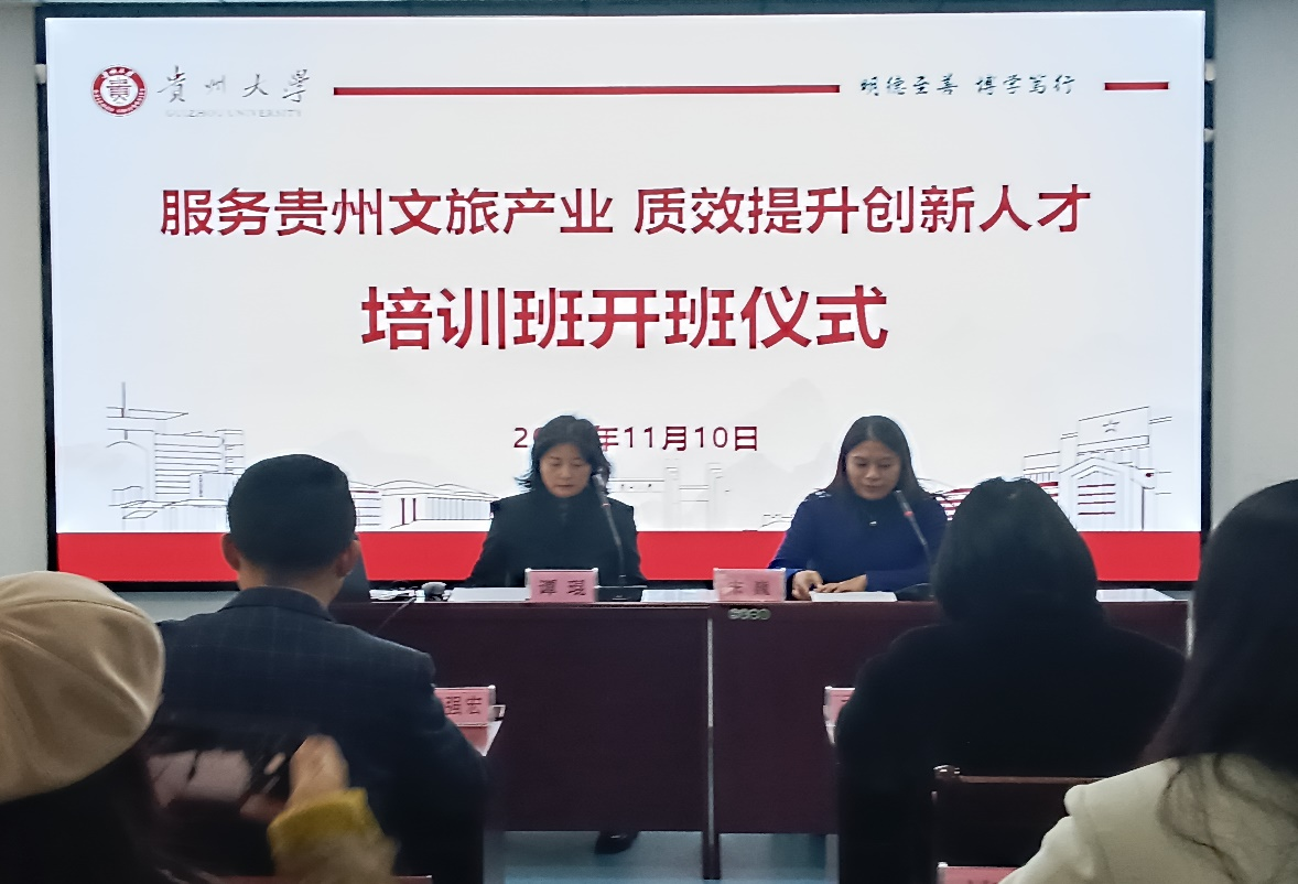2025年11月10日上午,受贵州省人力资源和社会保障厅、贵州省文化和旅游厅委托,由贵州大学继续教育学院专业技术人员培训中心承办的服务贵州文旅产业、质效提升创新人才培训班正式开班。此次培训班的50名学员是来自贵州省文化和旅游厅直属单位、各市(州)从事文化旅游产业工作的专业技术人员和相关企业的管理人员。在为期6天的培训中,学员们将围绕产业发展核心议题,开启一场“赋能提质、聚力创新”的学习之旅。