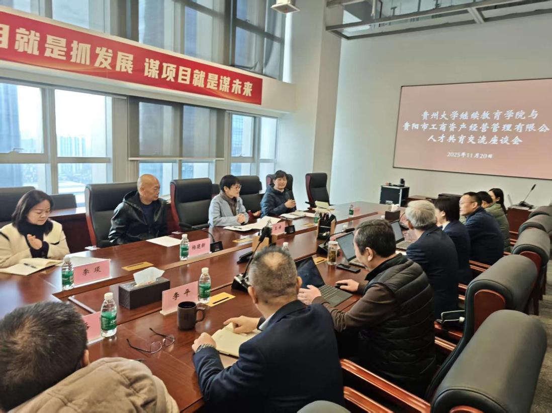 为深化校企合作内涵,共商人才培养大计,贵州大学继续教育学院与贵阳市工商资产经营管理有限公司于2025年11月20日上午在市工商资产会议室举行了人才共育交流座谈会。此次会议由贵阳市工商资产经营管理公司党委副书记吴林主持,双方相关领导及代表出席了会议。